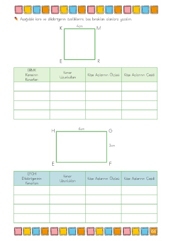Aşağıdaki kare ve dikdörtgenin özelliklerini, boş bırakılan alanlara yazalım.