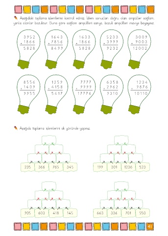Aşağıdaki toplama işlemlerini kontrol ediniz. İşlem sonuçları doğru olan ampüller sağlam,