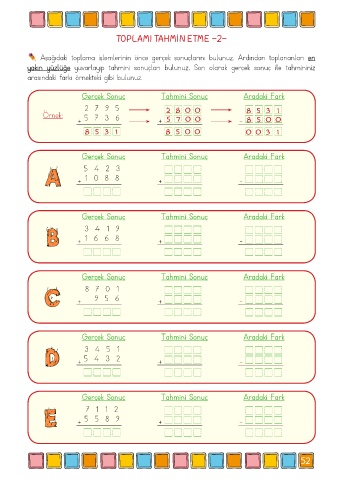 Aşağıdaki toplama işlemlerinin önce gerçek sonuçlarını bulunuz. Ardından toplananları en
