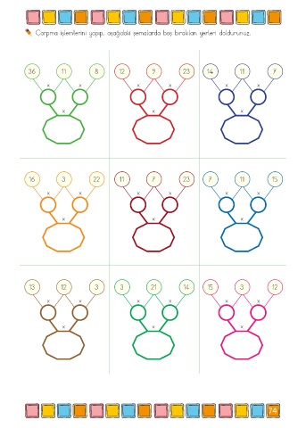 Çarpma işlemlerini yapıp, aşağıdaki şemalarda boş bırakılan yerleri doldurunuz. 36 11 8 12 9 23 14 11 7 x x x x x x x x x 16 3 22 11 7 23 7 11 15 x x x x x x x x x 13 12 3 3 21 14 15 3 12 x x x x x x x x x 74