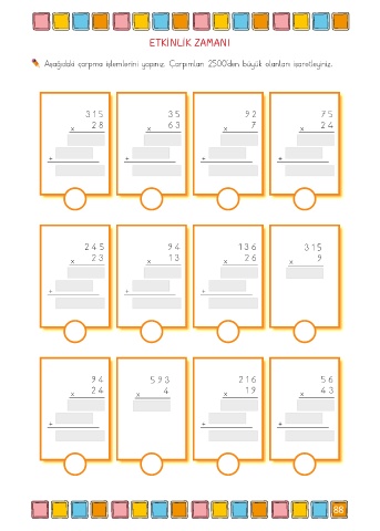 ETKİNLİK ZAMANI Aşağıdaki çarpma işlemlerini yapınız. Çarpımları 2500’den büyük olanları işaretleyiniz. 315 35 92 75 x 28 x 63 x 7 x 24 + + + + 245 94 136 315 x 23 x 13 x 26 x 9 + + + 94 593 216 56 x 24 x 4 x 19 x 43 + + + 88