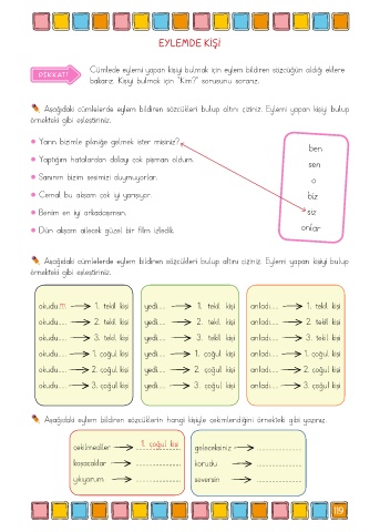 Aşağıdaki eylem bildiren sözcüklerin hangi kişiyle çekimlendiğini örnekteki gibi yazınız.