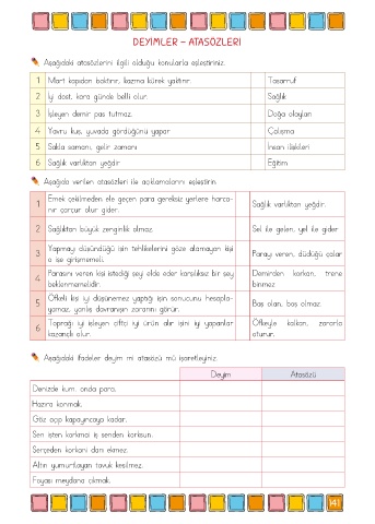 Aşağıdaki atasözlerini ilgili olduğu konularla eşleştiriniz.