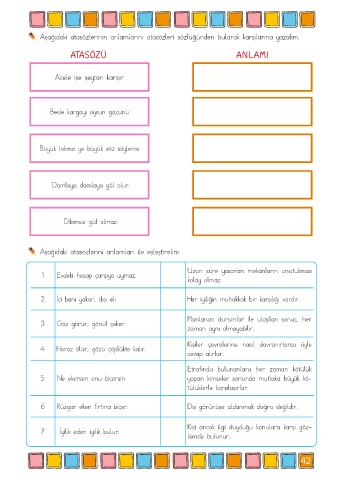 Aşağıdaki atasözlerini anlamları ile eşleştirelim.