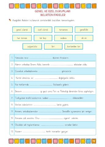 Aşağıdaki ifadeleri kullanarak cümlelerdeki boşlukları tamamlayalım.