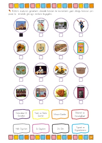 Kültürü oluşturan görsellerin altındaki kutuları ile kavramların yazılı olduğu kutunun çer-