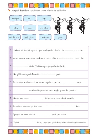 10 Zeybek, ..................................... , halay, çayda çıra gibi halk oyunları kültürel ögelerimizdendir.