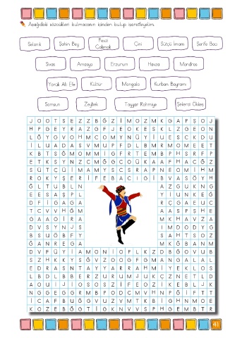 Aşağıdaki sözcükleri bulmacanın içinden bulup işaretleyelim. Fevzi Selanik Şahin Bey Çini Sütçü İmam Şerife Bacı Çakmak Sivas Amasya Erzurum Havza Mondros Yörük Ali Efe Kültür Mangala Kurban Bayramı Samsun Zeybek Tayyar Rahmiye Şekerci Ökkeş 41