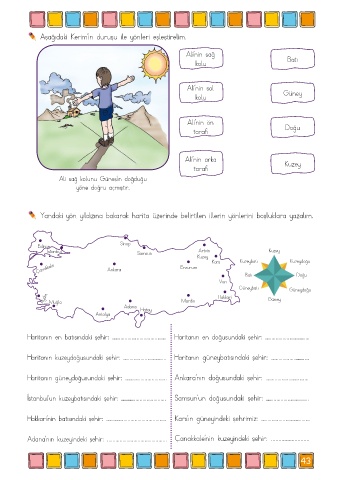 Yandaki yön yıldızına bakarak harita üzerinde belirtilen illerin yönlerini boşluklara yazalım.