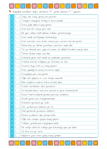 Aşağıdaki cümlelerin doğru olanlarına “D”, yanlış olanlara “Y “ yazalım.