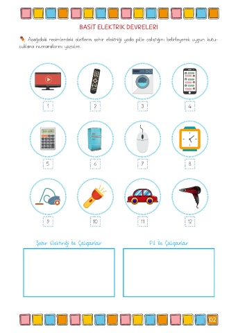 BASİT ELEKTRİK DEVRELERİ Aşağıdaki resimlerdeki aletlerin şehir elektriği yada pille çalıştığını belirleyerek uygun kutu- cuklara numaralarını yazalım. 1 2 3 4 5 6 7 8 9 10 11 12 Şehir Elektiriği İle Çalışanlar Pil İle Çalışanlar 102