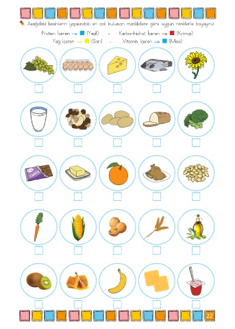 Aşağıdaki besinlerin yapısındaki en çok bulunan maddelere göre uygun renklerle boyayınız. Protein İçeren (Yeşil) - Karbonhidrat İçeren (Kırmızı) Yağ İçeren (Sarı) - Vitamin İçeren (Mavi) 22