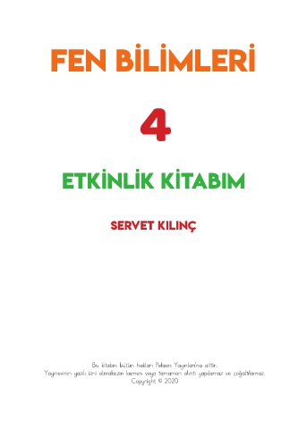 FEN BİLİMLERİ 4 ETKİNLİK KİTABIM SERVET KILINÇ Bu kitabın bütün hakları Pekşen Yayınları’na aittir. Yayınevinin yazılı izni olmaksızın kısmen veya tamamen alıntı yapılamaz ve çoğaltılamaz. Copyright © 2020