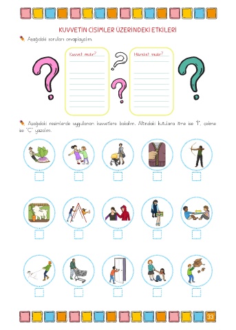 KUVVETİN CİSİMLER ÜZERİNDEKİ ETKİLERİ Aşağıdaki soruları cevaplayalım. Kuvvet nedir? Hareket nedir? Aşağıdaki resimlerde uygulanan kuvvetlere bakalım. Altındaki kutulara itme ise “İ”, çekme ise “Ç” yazalım. 33