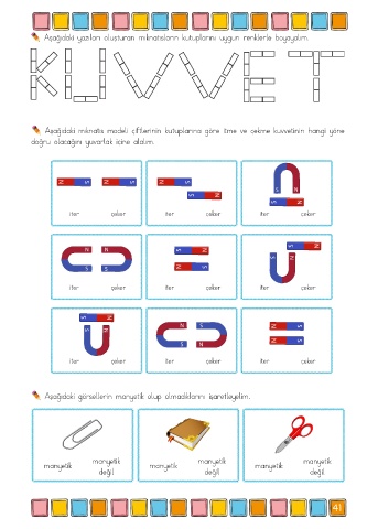 Aşağıdaki yazıları oluşturan mıknatısların kutuplarını uygun renklerle boyayalım.