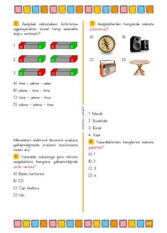 5 Aşağıdaki mıknatısların birbirlerine 7 Aşağıdakilerden hangisinde mıknatıs