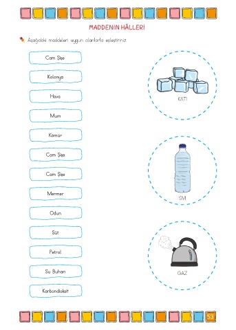 MADDENİN HÂLLERİ Aşağıdaki maddeleri uygun alanlarla eşleştiriniz. Cam Şişe Kolonya Hava KATI Mum Kömür Cam Şişe Cam Şişe Mermer SIVI Odun Süt Petrol Su Buharı GAZ Karbondioksit 53