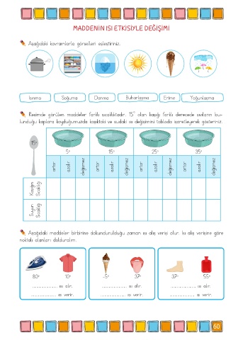 lunduğu kaplara koyduğumuzda kaşıktaki ve sudaki ısı değişimini tabloda işaretleyerek gösteriniz.