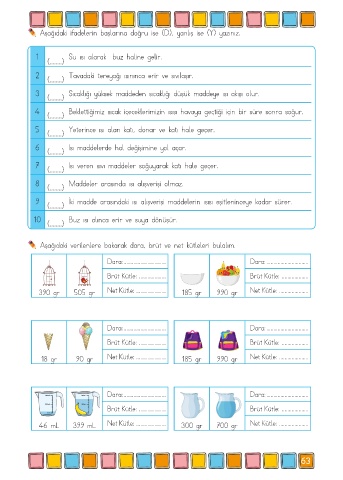 İçinde hiçbir madde olmayan kabın kendi ağırlığına dara denir. 5 (........) Yeterince ısı alan katı, donar ve katı hale geçer.