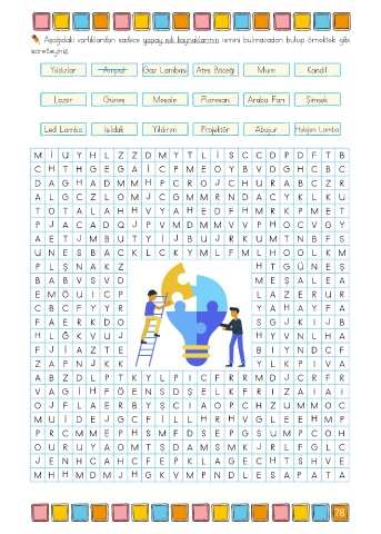 Aşağıdaki varlıklardan sadece yapay ışık kaynaklarının ismini bulmacadan bulup örnekteki gibi