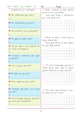 Gün - Hafta - Ay - Mevsim - Yıl Adı: ....................... Soyadı: ...........................