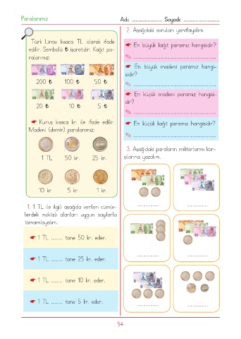 1 TL 50 kr. 25 kr. şılarına yazalım.