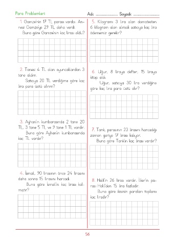 1. Gamze’nin 17 TL parası vardoı. An- 5. Kilogramı 3 lira olan domatesten