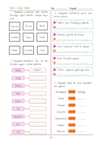 1. Aşağıdaki isimlerden tekil olanları 3. Aşağıdaki cümlelerde geçen özel