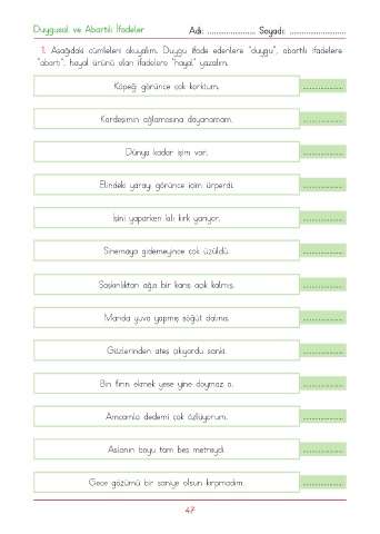 1. Aşağıdaki cümleleri okuyalım. Duygu ifade edenlere “duygu”, abartılı ifadelere