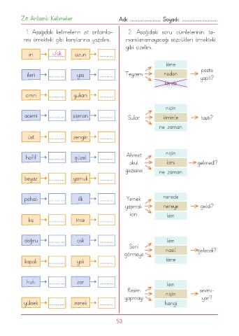 1. Aşağıdaki kelimelerin zıt anlamla- 2. Aşağıdaki soru cümlelerinin ta-