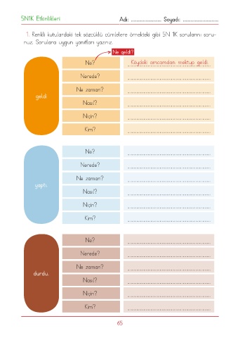 1. Renkli kutulardaki tek sözcüklü cümlelere örnekteki gibi 5N 1K sorularını soru-