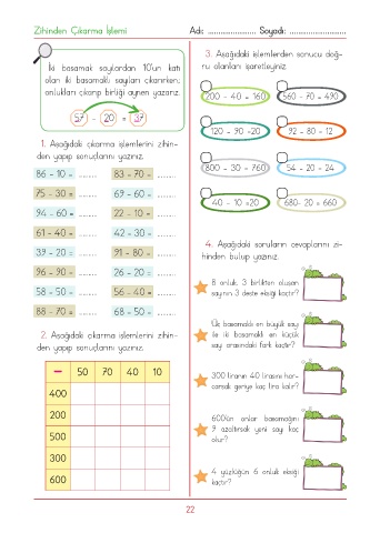 2. Aşağıdaki çıkarma işlemlerini zihin- ile iki basamaklı en küçük