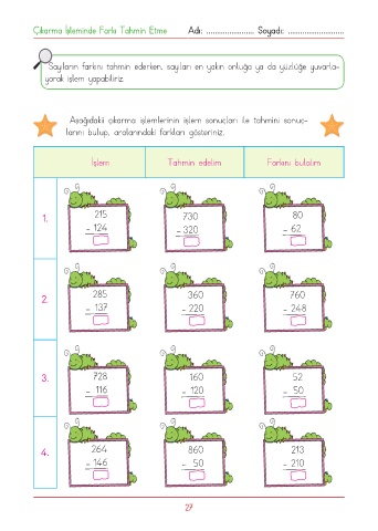 Çıkarma İşleminde Farkı Tahmin Etme Adı: ....................... Soyadı: ...........................
