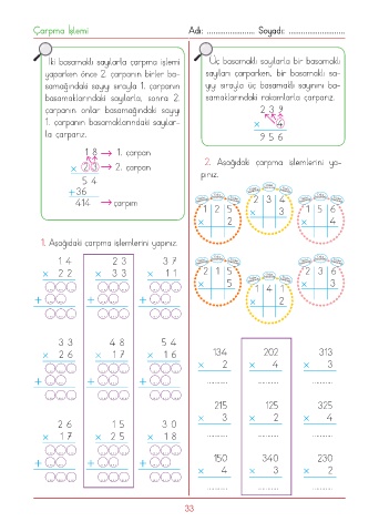 yaparken önce 2. çarpanın birler ba- sayıları çarparken, bir basamaklı sa-