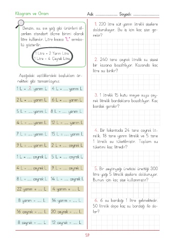 8 yarım = ..... L 14 yarım = ..... L 6. 6 su bardağı 1 litre gelmektedir.