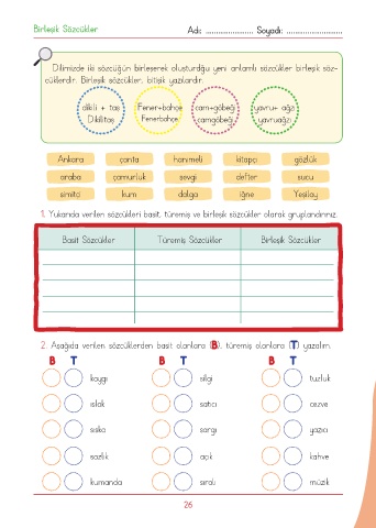 2. Aşağıda verilen sözcüklerden basit olanlara (B), türemiş olanlara (T) yazalım.