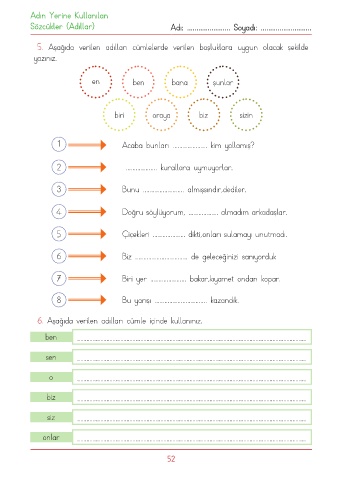 5. Aşağıda verilen adılları cümlelerde verilen boşluklara uygun olacak şekilde