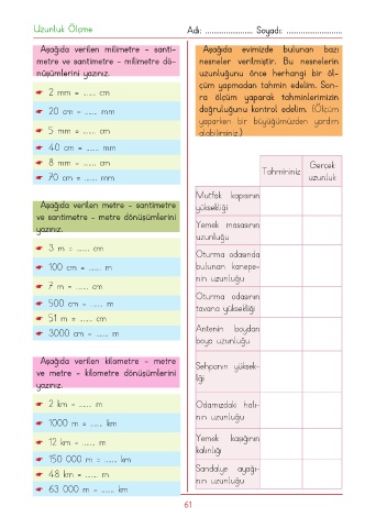 metre ve santimetre - milimetre dö- nesneler verilmiştir. Bu nesnelerin