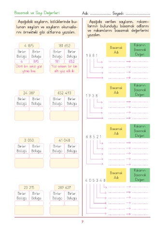 Basamak ve Sayı Değerleri Adı: ....................... Soyadı: ...........................