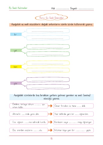 Aşağıdaki eş sesli sözcüklerin değişik anlamlarını cümle içinde kullanarak yazınız.