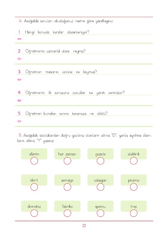 B. Aşağıdaki sözcüklerden doğru yazılmış olanların altına “D”, yanlış ayrılmış olan-