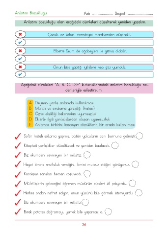 Aşağıdaki cümleleri “A, B, C, D,E” kutucuklarındaki anlatım bozukluğu ne-