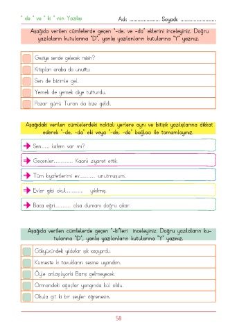 ‘‘ de ’’ ve ‘‘ ki ‘‘ nin Yazılışı Adı: ....................... Soyadı: ...........................