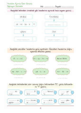 Aşağıdaki kelimelerden satır sonuna doğru bölünenlere “D”, yanlış bölünenle-