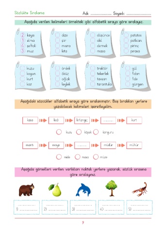 Aşağıda görselleri verilen varlıkları noktalı yerlere yazarak, sözlük sırasına