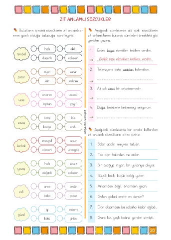 rının yazılı olduğu kutucuğu işaretleyiniz. zıt anlamlılarını bularak cümleleri örnekteki gibi
