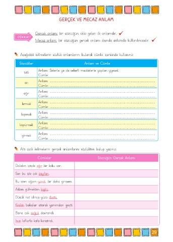 Altı çizili kelimelerin gerçek anlamlarını sözlükten bulup yazınız.
