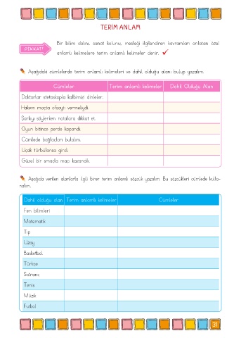 Aşağıda verilen alanlarla ilgili birer terim anlamlı sözcük yazalım. Bu sözcükleri cümlede kulla-