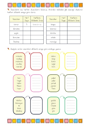 Aşağıda verilen sözcükleri alfabetik sıraya göre sıralayıp yazınız.