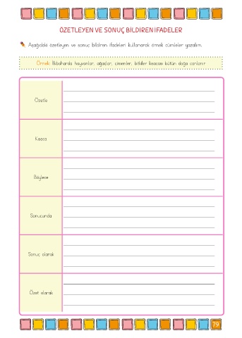 Aşağıdaki özetleyen ve sonuç bildiren ifadeleri kullanarak örnek cümleler yazalım.